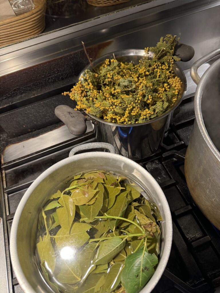 Above: Rainbow eucalyptus (Eucalyptus deglupta), front, and acacia (Acacia sp.), back, leaves simmer in pots on the stove.