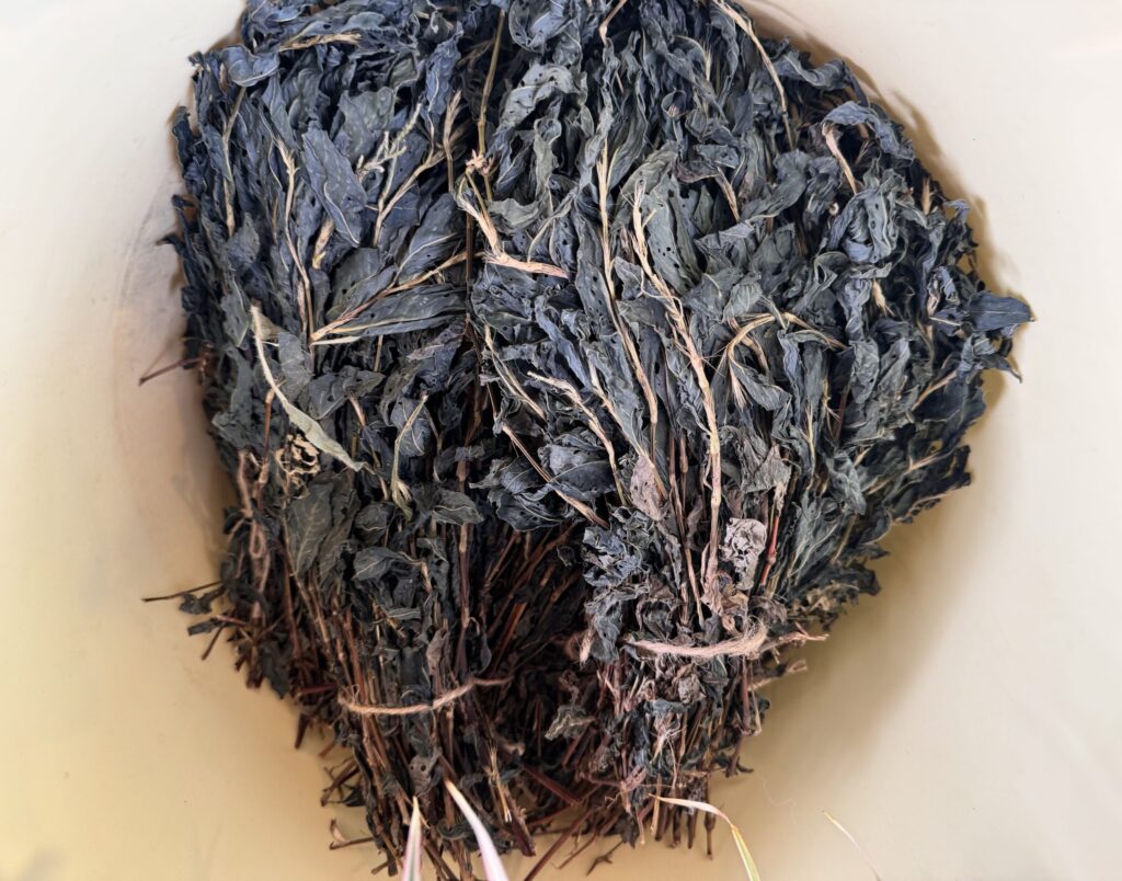 We stepped outside to look at the planters where Hiroki grows indigo to use in Aizome, a traditional Japanese dyeing style that uses plants as a foundation. Indigo has great cultural significance across the globe with legacies in ancient Egypt, Japan, India, Africa, and Peru. In North America, indigo is native to coastal regions of the Southeast and was among the most significant cash crops of the 1700s.