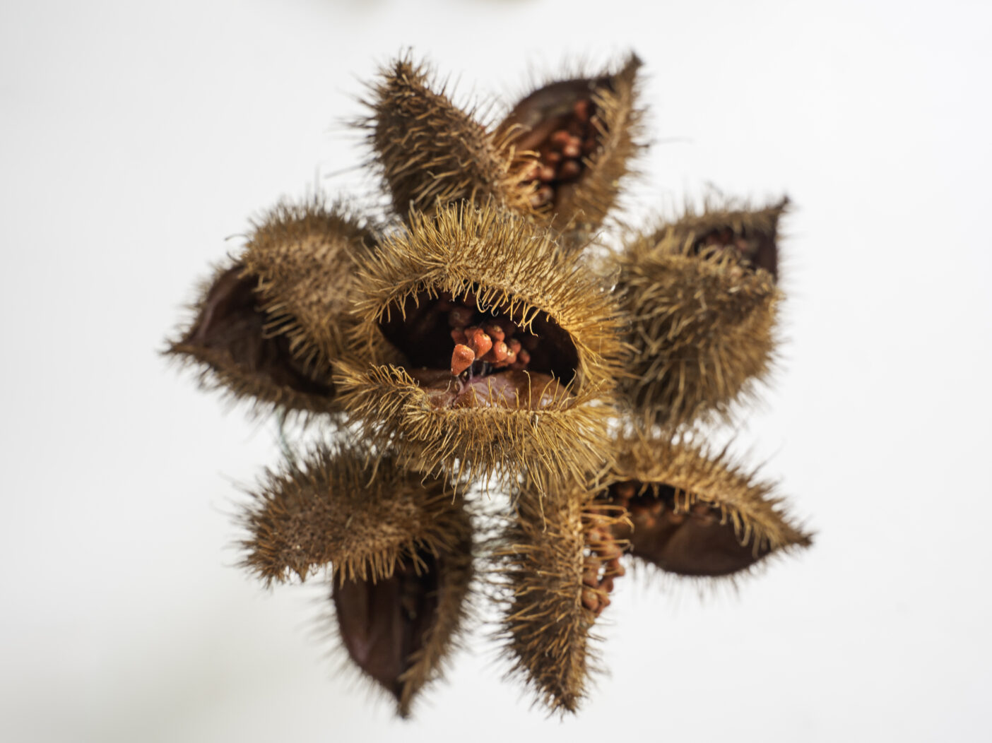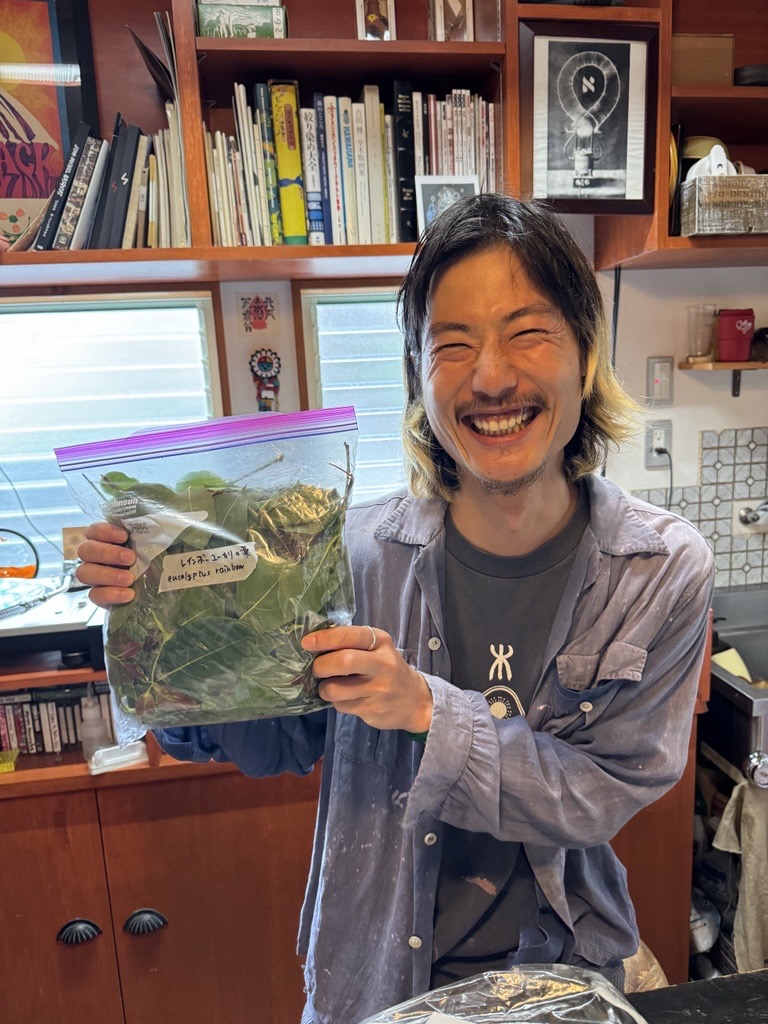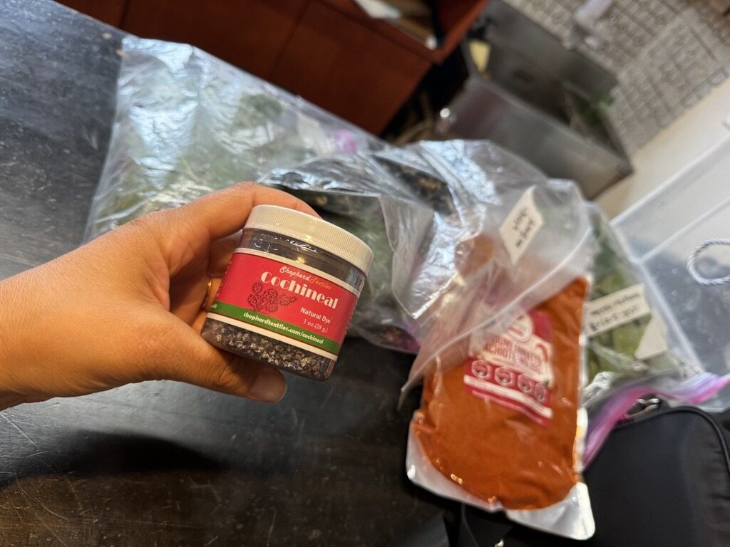 I, in turn, shared some of my go-to natural dyeing supplies. I brought him some dried and ground annatto spice, derived from the seeds of the achiote tree, Bixa orellana. Annatto is commonly used as a spice in Latin American, Caribbean, and Filipino cuisines. In those regions, it is also used in traditional dyeing practices, producing rich, warm gold and ochre colors. Hiroki was thrilled. He was familiar with most of the plants, but he didn’t have access to them.