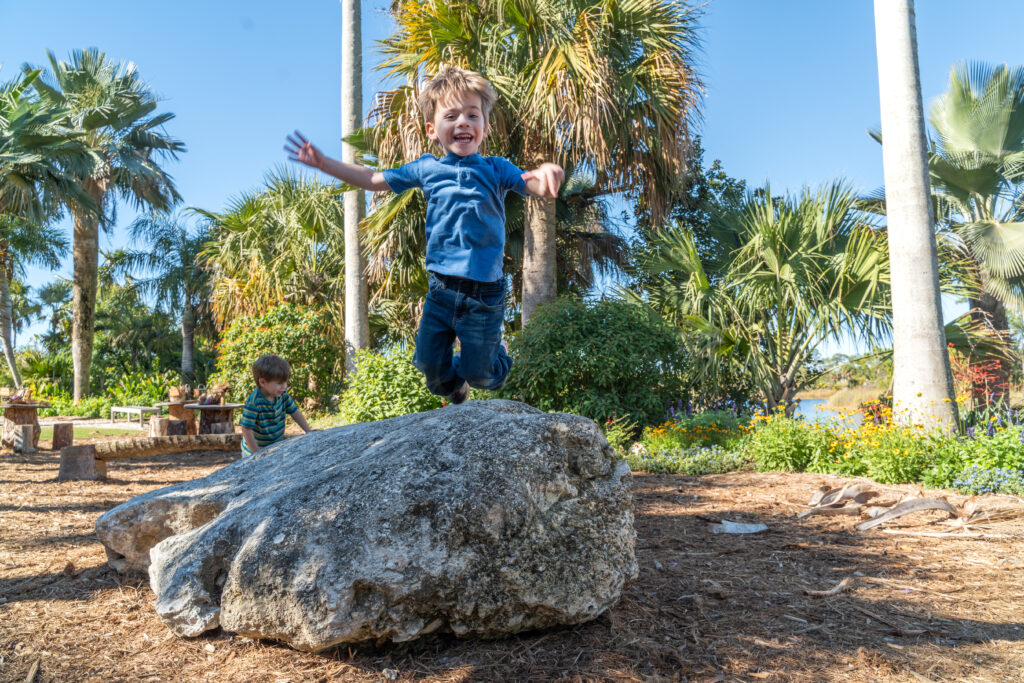 Palm Hop: A felled ficus, craggy rocks, and stair-like stumps beckon young adventurers to test their physical prowess in this extensive open space within the Kapnick Caribbean Garden. They’ll also find baskets filled with nature’s equivalent of a craft closet—bark, blooms, sticks, palm fronds, fallen leaves, and flowers—ready to be transformed into playthings.